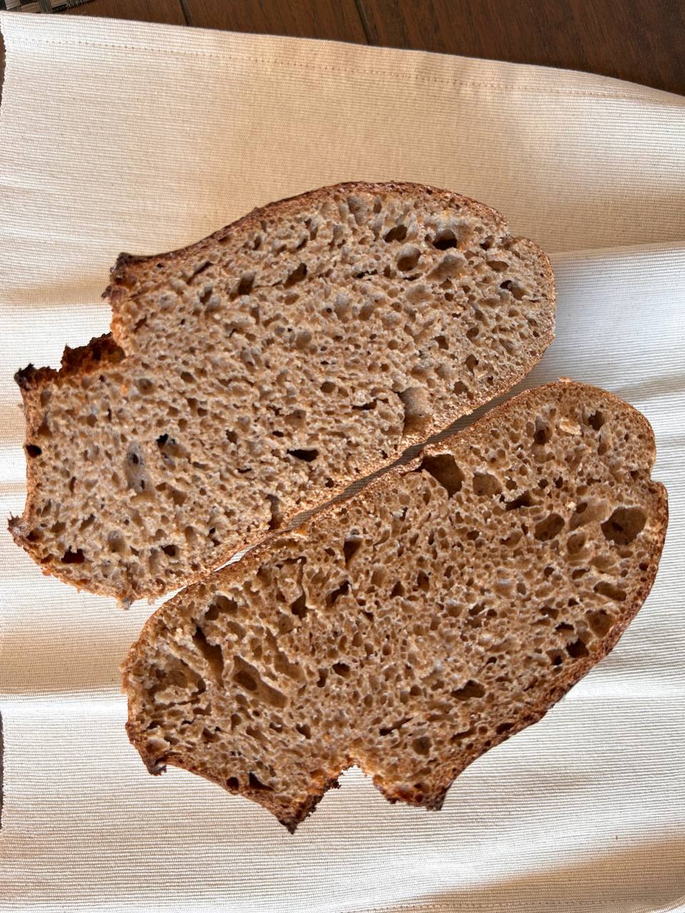 El resultado es una acidez suave y elegante, lejos de cualquier exceso, que acaricia el paladar y equilibra la dulzura natural de la malta. La fermentación lenta también favorece una miga aireada, flexible y húmeda, con alveolos bien formados y una textura que se mantiene agradable durante más tiempo. Cada rebanada ofrece profundidad, ligereza y una sensación de pan vivo, hecho con intención y sin prisas.
