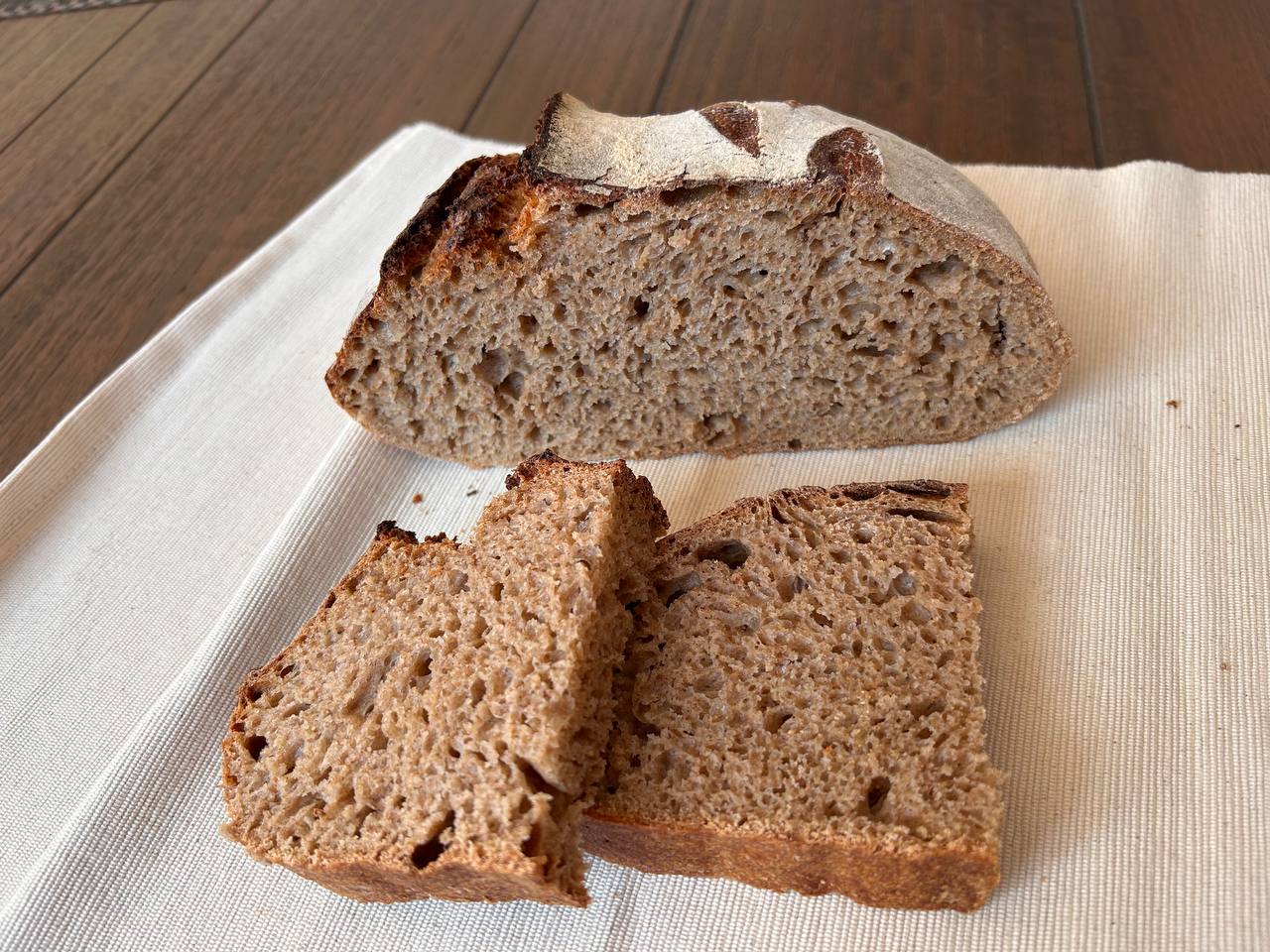 Este pan de malta con masa madre tiene una personalidad envolvente. La harina integral aporta notas terrosas y auténticas; la harina de fuerza da cuerpo, elasticidad y una estructura firme; la malta suma redondez, color y un susurro tostado que hace cada bocado más complejo. Juntas, estas tres fuerzas construyen un pan equilibrado, sabroso y lleno de matices.